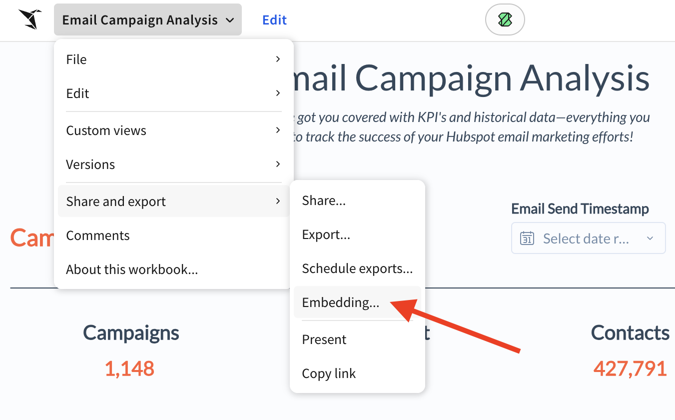 Open the Sigma workbook you want to share. Click the down arrow next to the workbook name in the header, then select Share and export > Embedding.