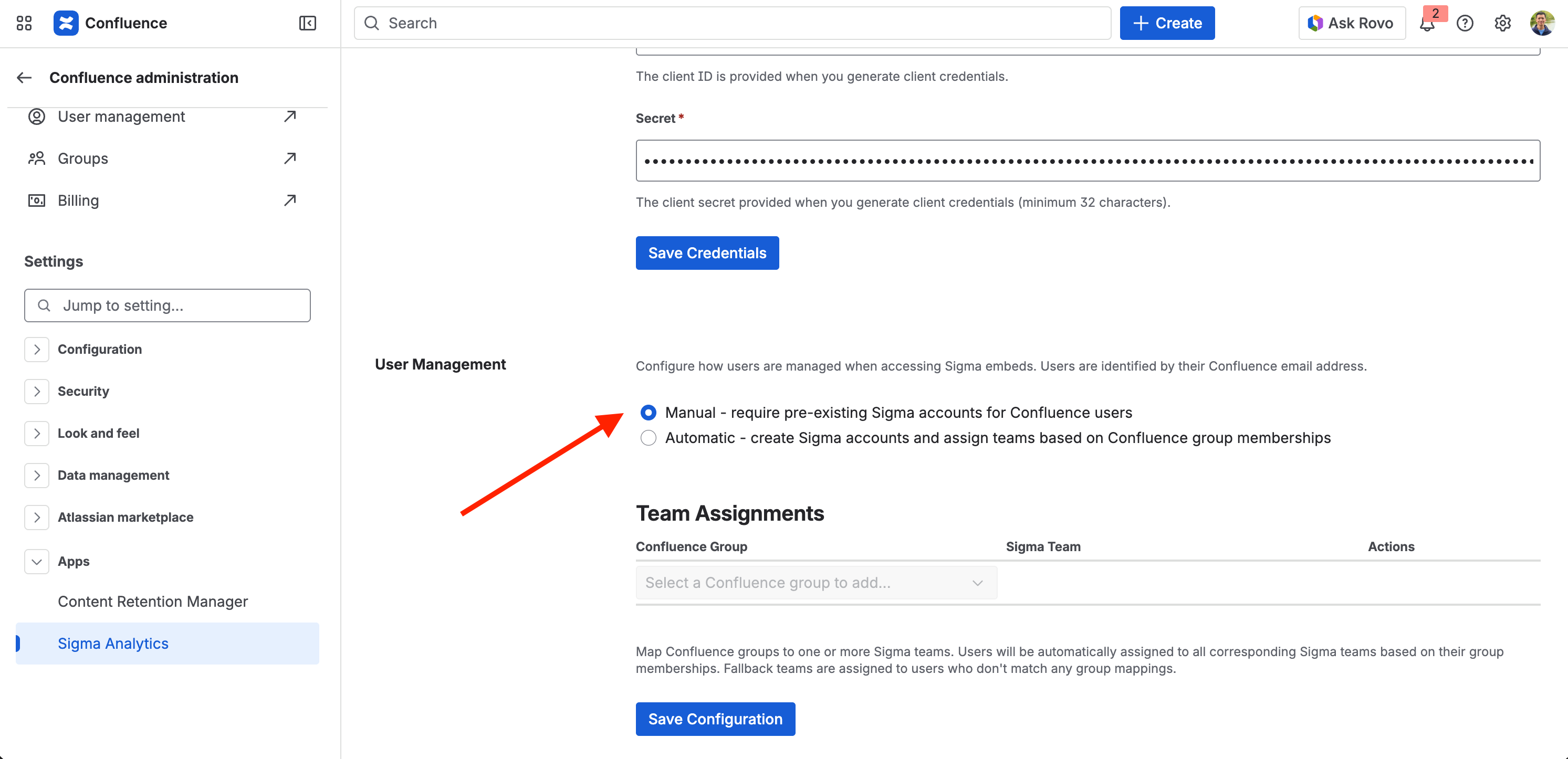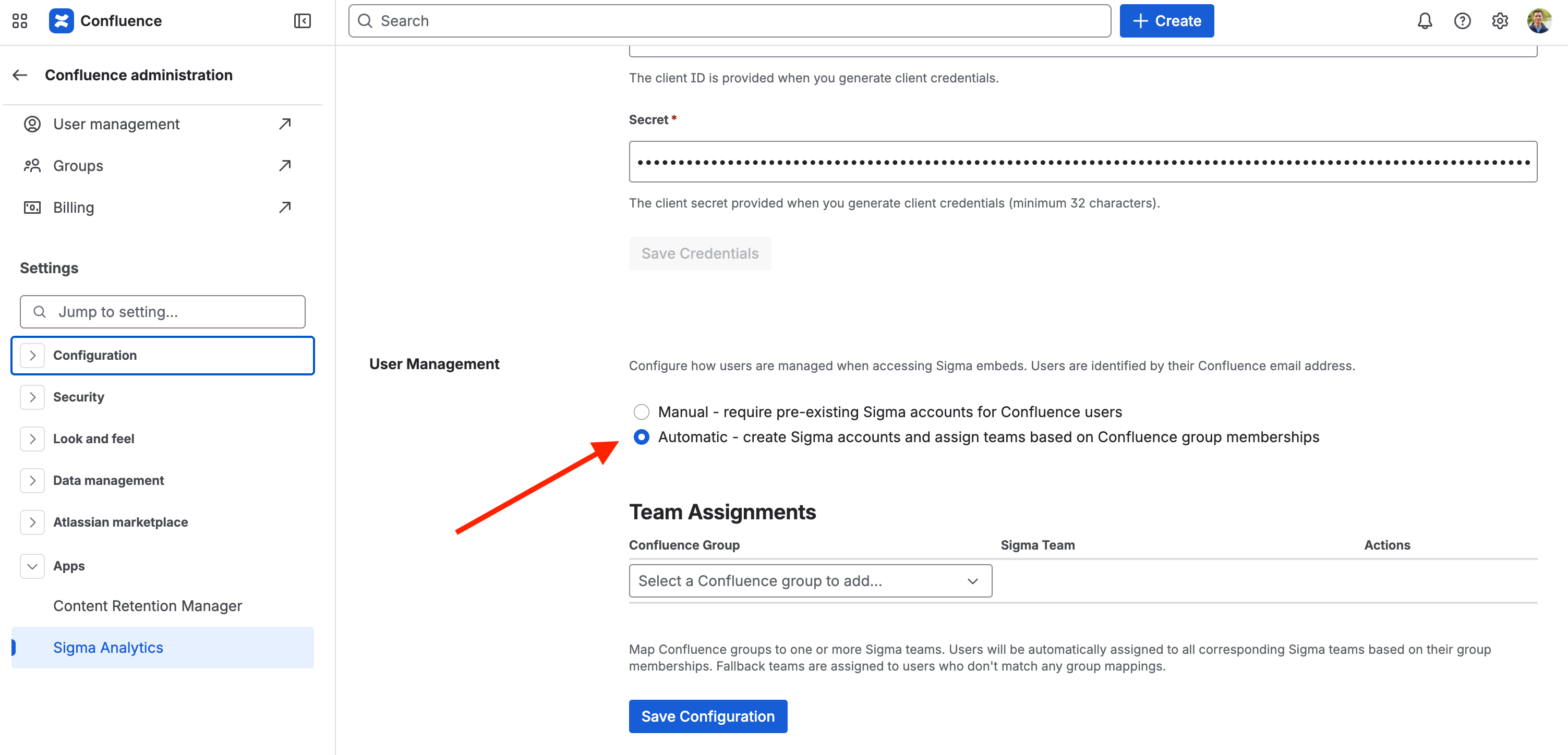 - Automatic User Management - User accounts are automatically created on first access and assigned to Sigma teams based on Confluence group memberships. Best for broad access without pre-provisioning.