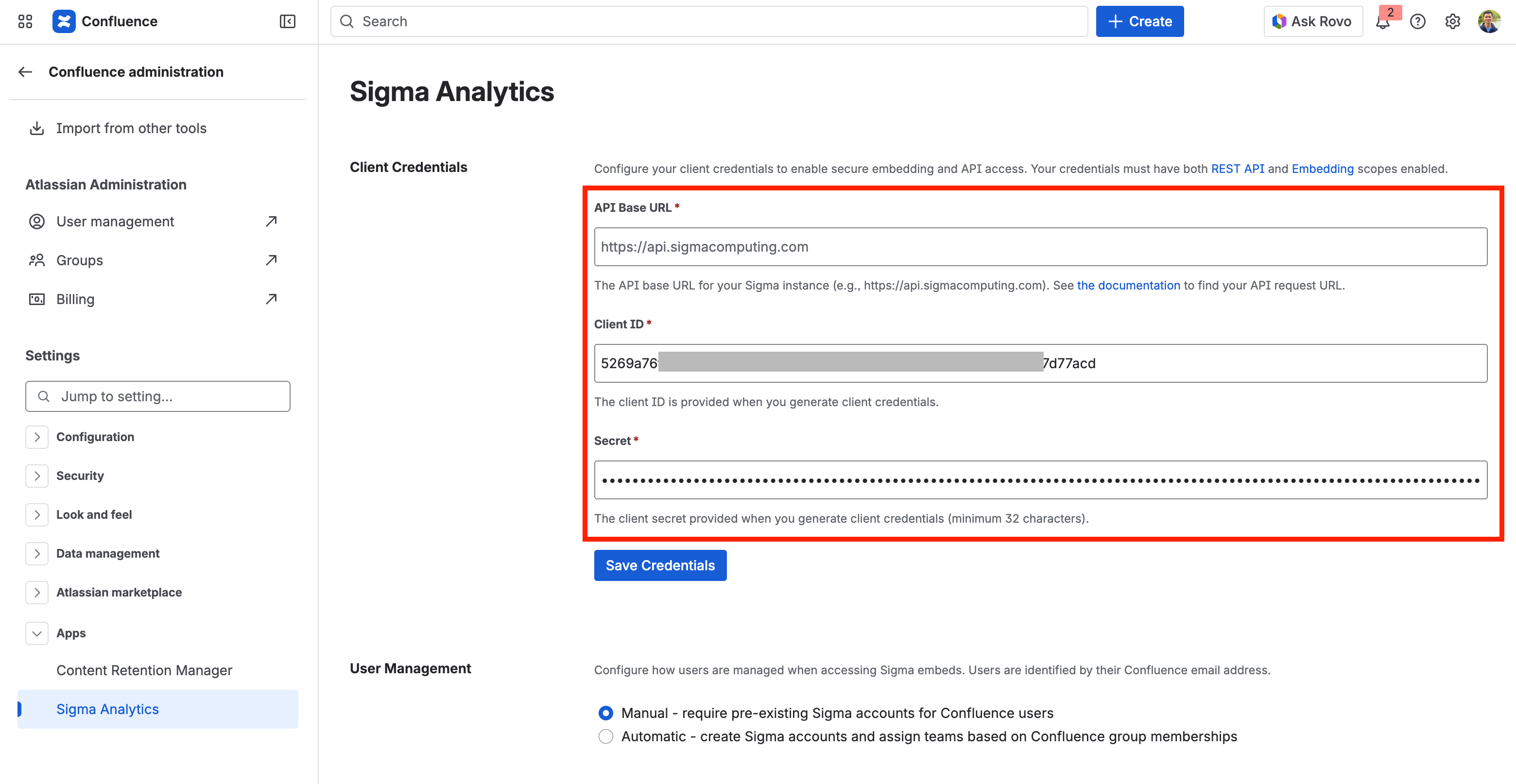 - Sigma Administration access - Required to generate client credentials, configure embedding settings, and retrieve Sigma teams when mapping Confluence groups