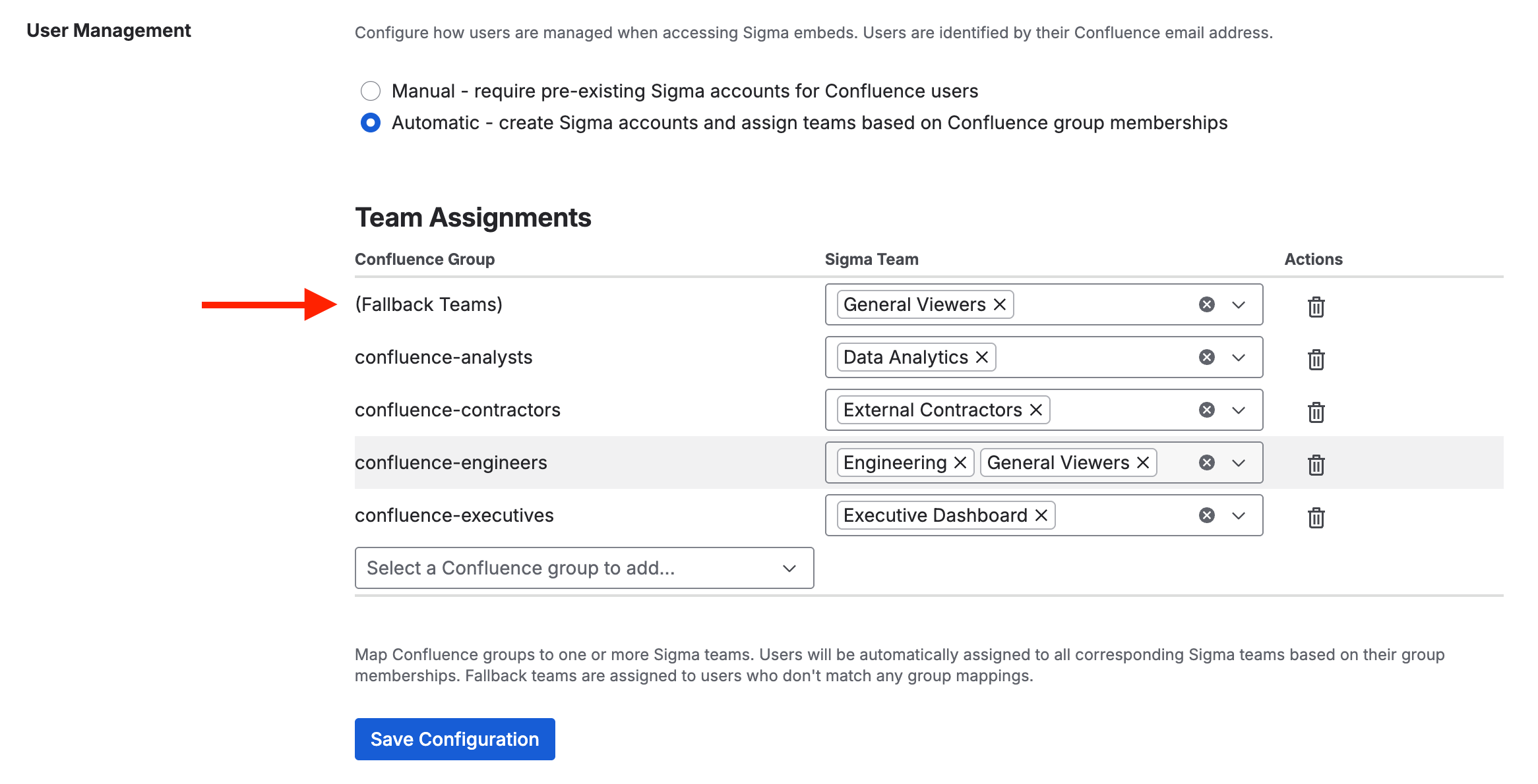 In the Team Assignments table below, map Confluence groups to Sigma teams. Click the dropdown in the last row and select a Confluence group - start typing to search if you have many groups. After selecting the group, a new row appears where you can choose one or more Sigma teams. Type to search and narrow down the team list. Click Save Configuration to apply your configuration.