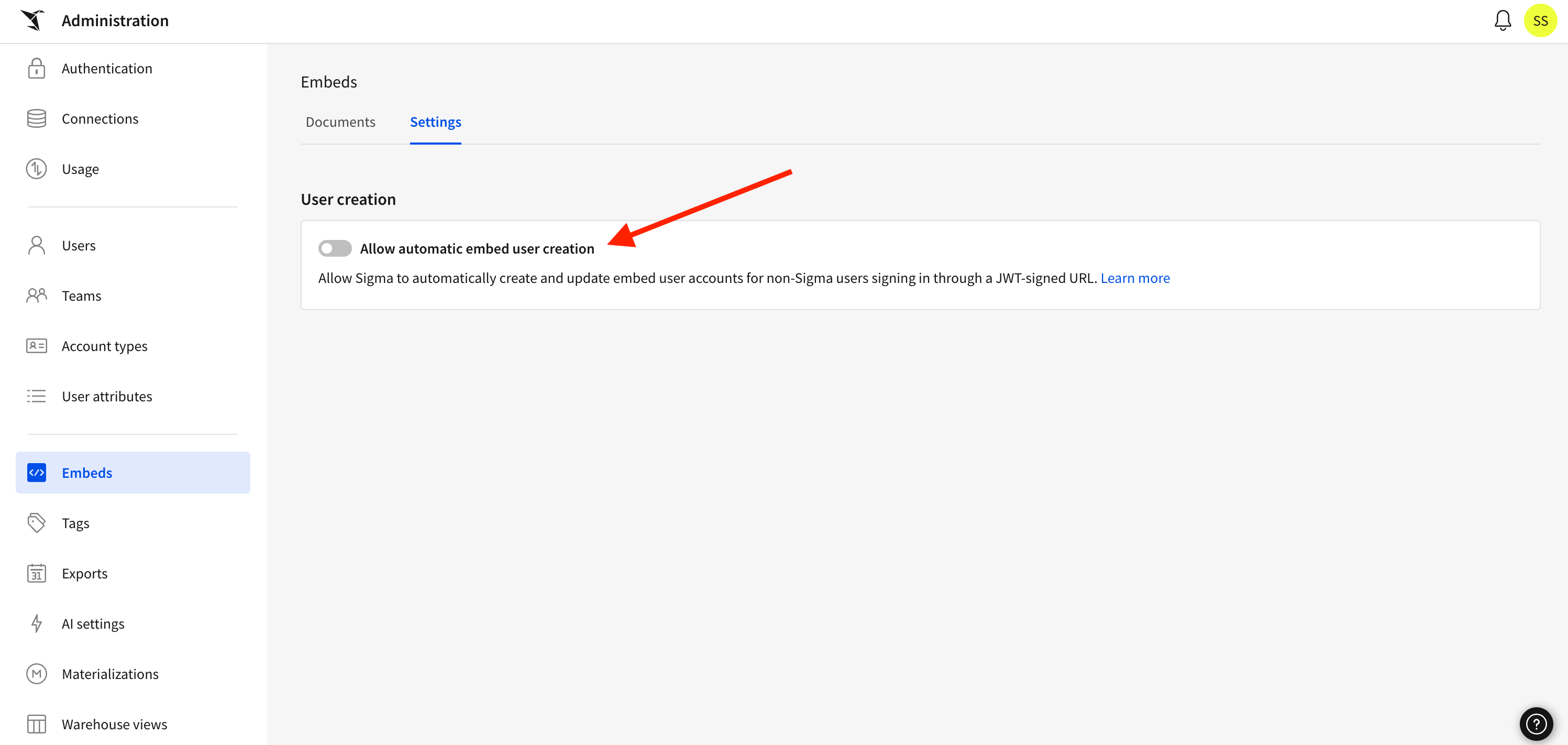 - Ensure "Allow automatic embed user creation" is enabled in Sigma Administration.